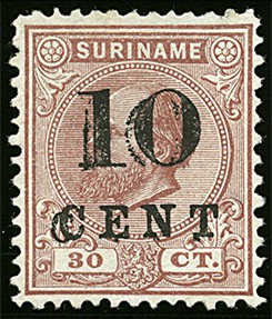 33fa, 10 cent op 30 ct. lilabruin met gedeeltelijk dubbele opdruk, ongebr. prachtex. € 350