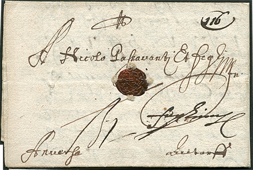 Zweedse Post in Duitsland. Frisse, cpl. vouwbrief van Bazel 12-8-1631 via Lieser naar Antwerpen, waarop geschreven port 'S 1' en 'frc.p.Rheinhausen', en ook een prachtig lakzegel met touwtjes