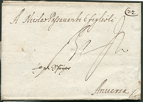 Frisse, cpl. vouwbrief van Bazel 27-1-1632 via Speyer naar Antwerpen, waarop geschreven port 'S1:2' en 'frc.p.Speyer', met op az. mooi lakzegel met touwtje