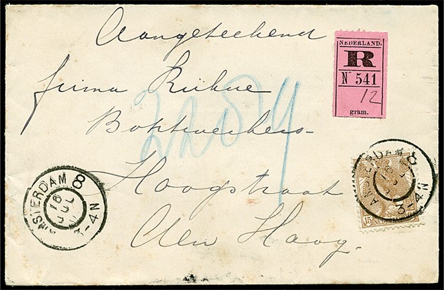 15 Cent bruin type Bontkraag als enkelfrankering op R-couvert van 12 gram van Amsterdam 8 [= Hobbemastraat] 16-7-1903 naar 'sGravenhage 16-7