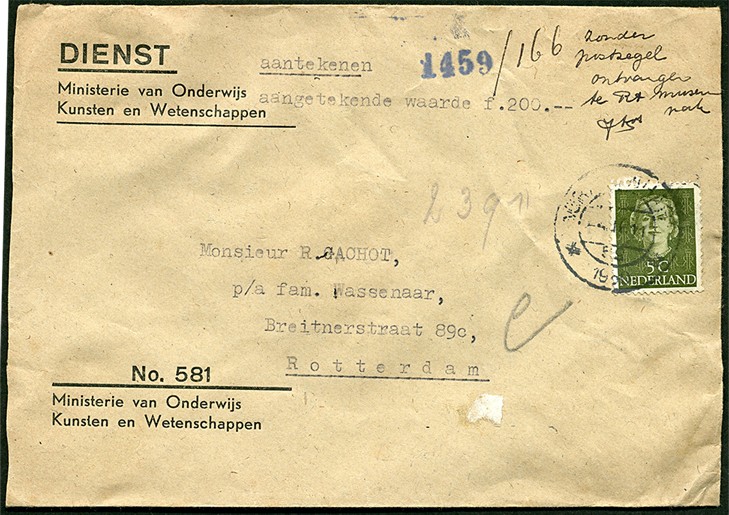 Dienstcouvert met aangegeven waarde van ƒ 200 waarvoor 5 cent recht moest worden voldaan, gefr. met 5c van 'sGravenhage 4-2-1950 naar Rotterdam-Museumpark 6-2, met rechtsboven notitie 'zonder postzegel ontvangen te Rt Museumpark' + paraaf, mogelijk omdat de postbeambte niet meteen begreep dat alleen het recht voor de aangegeven waarde moest worden verantwoord