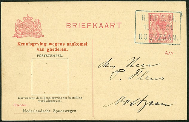 Spoorwegbk. NS103-Ic afgest. met rechthoekig stempel H.IJ.S.M. / 15.JAN.21. / OOSTZAAN. (aankomst van zak tabak), alsmede bk. G82I prachtig afgest. GOCH-BOXTEL (C) 30.XI.11. naar België