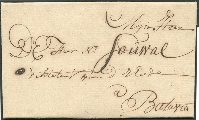 COMPLETE VOUWBRIEF OP 16 AUGUSTUS 1758 GESCHREVEN DOOR CHIRURGIJN LENIGS AAN BOORD VAN HET SCHIP 'AMELISWEERT', LIGGENDE OP DE REDE VAN BATAVIA, GERICHT AAN DE HEER SOUWEL, VISITATEUR (= BELAST MET DE CONTROLE EN VOERDE INSPECTIES UIT OP DE BOEKHOUDING VAN VOC-SCHEPEN) 'VAN D' RHEEDE A BATAVIA'. DE CHIRURGIJN DOET O.A. ZIJN BEKLAG OVER EEN ONBEKWAME ONDERMEESTER, DIE HIJ 'TOT NU TOE NIET NUGTEREN, MAAR WEL BEESTACHTIG BESOPEN GEZIEN HEBBE', EN VRAAGT DE VISITATEUR HEM DAN OOK TE DOEN VERVANGEN. HET SCHIP 'AMELISWEERT' WERD IN 1753 GEBOUWD EN IS IN 1764, TIJDENS EEN REIS NAAR SURAT (VOC-VESTIGING AAN DE WESTKUST VAN INDIA) VERGAAN. MOOI BEWAARD GEBLEVEN VROEGE BRIEF, GESLOTEN MET EEN LAKZEGEL. TRANSCRIPTIE BIJGEVOEGD, MET DANK AAN MICHAEL BREKELMANS