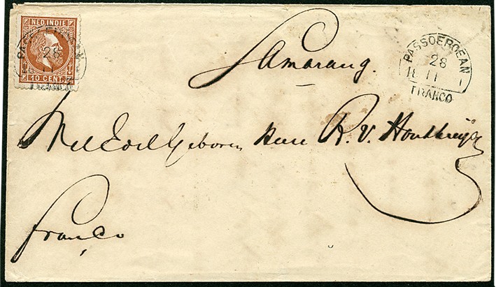 10 Cent nr. 9A (prachtex.) op env. van PASSOEROEAN 28-11-1871 naar Samarang 1-12