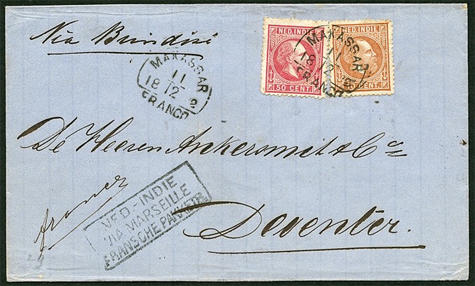Briefomslag gefr. met 10c en 50c afgest. halfrond-franco Makassar 11-12-1872 met de Fransche Pakketb. via Marseille naar Deventer 27-1-1873