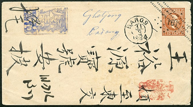 Env. G6 afgest. puntstempel 101 van Baros 31-3-1884 naar Padang 3-4. Mooie stempelafdrukken!