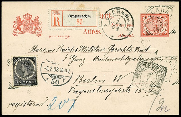Bk. G14 bijgefr. met 10c Veth aangetekend van Singaradja 30-12-1907 over Soerabaja 1-1-1908 en Weltevreden 3-1 naar Berlijn 5-2