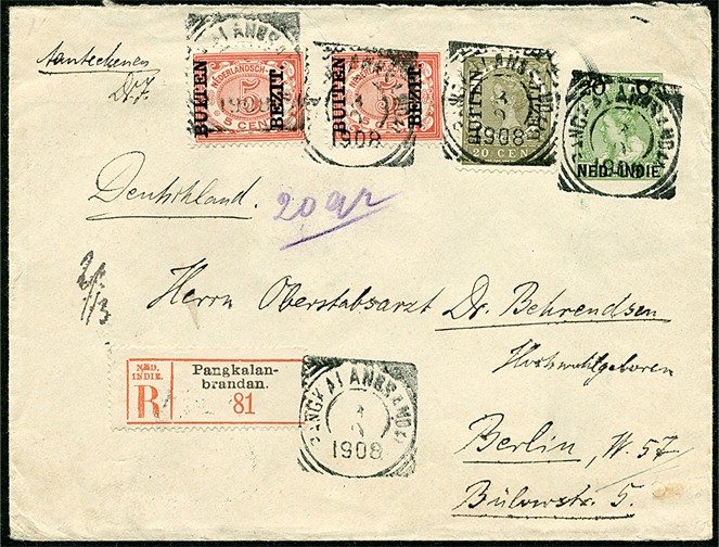 Env. G17 bijgefr. met Buiten Bezit.-zegels van 5c (2x) en 20c aangetekend van Pangkalanbrandan 4-9-1908 naar Berlijn 3-10, alsmede env. G38 bijgefr. met 7½c aangetekend van Weltevreden 15-7-1919 naar een heer van stand te Rotterdam 23-8