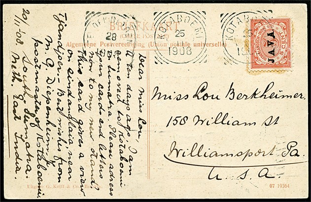 Prentbk. gefr. met 5c met JAVA.-opdruk (fraai) van KOTABOEMI 25-11-1908 via Teloekbetoeng 28-11 naar de USA. De afzender is de postchef M.G. Diepenheim van Kotaboemi, die de zegel vanuit Java tien dagen eerder zal hebben meegenomen (VK, SvL 275)