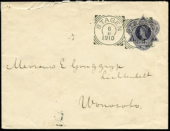 Env. G18 iets ruw geopend, maar met twee luxe afdrukken STAGEN 6-8-1910, naar Wonosobo 18-8 (VK, SvL 150)
