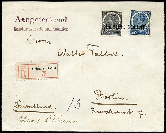 Env. gefr. met 10c en 12½c Veth aangetekend van Lebong Soelit over Benkoelen 8-10-1911 naar Berlijn 6-11