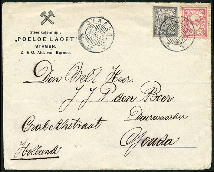 Env. van de Steenkolenmijn gefr. met 5c en 7½c (mengfrankering) van STAGEN 31-10-1913 naar een deurwaarder te Gouda 5-12 (KB, SvL 225)