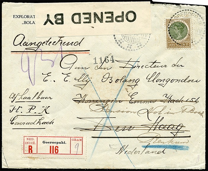 Env. gefr. met 22½c Veth van de gouddelvers te Goeroepahi op 16-4-1918 aangetekend over Menado 20-4, via geallieerde censors, naar 'sGravenhage 15-7, doorgez. naar Renkum 17-7