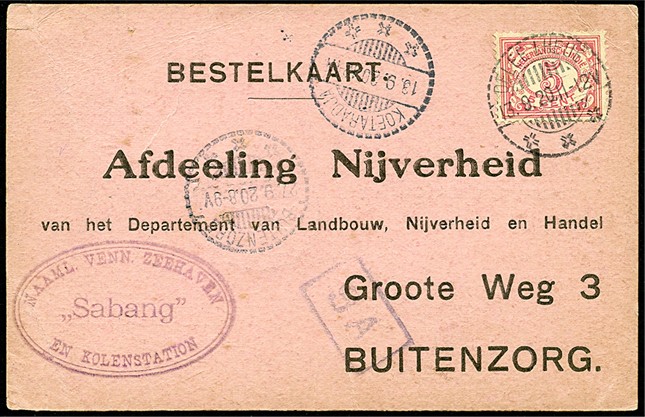 Bestelkaart gefr. met 5c waarop mooie afst. OELEE LHEUE 13-9-1920 via Koeraradja 13-9 naar Buitenzorg 27-9. Zeldzame langebalk (LB, SvL 400)