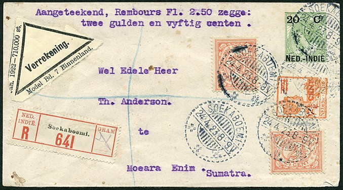Env. G17, al sedert 1-4-1908 niet meer geldig, bijgefr. met 2x 2½c en 12½c als verrekenzending van ƒ 2,50 van Soekaboemi 24-4-1923 naar Moearaenim (briefport 12½c + R-recht 20c + vastrecht 5c = 37½ cent)