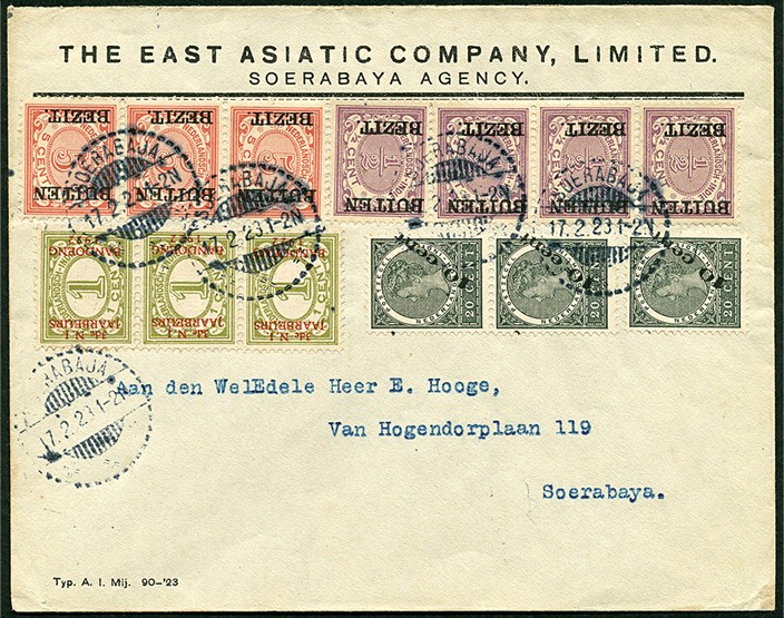 Firmacouvert weelderig gefr. met kopstaande Buiten Bezit. van ½c nr. 81f in strip van vier, 5 cent nr. 86f in strip van drie, alsmede 10 cent nr. 62 (3x) en 1 cent Jaarbeurs Bandoeng nr. 149 in strip van drie, allemaal prachtex. lokaal verz. te Soerabaja 17-2-1923