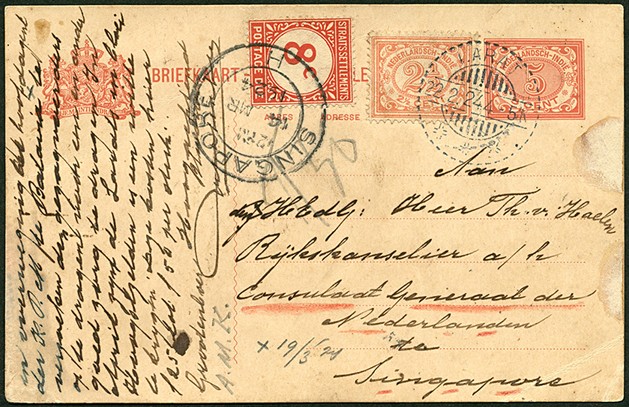 Bk. G21 (wat smoezelig) bijgefr. met 2½c nr. 104 van LARAT 22-2-1924 (in de Molukken) naar Singapore en daar op 14-3 met 8c beport omdat tarief 12½ cent bedroeg (LB, SvL R)