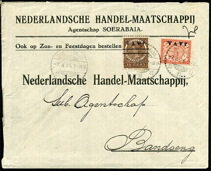 Firmacouvert gefr. met kopstaande opdrukken JAVA. nrs. 68f en 72f van Soerabaja 7-4-1925 naar Bandoeng 8-4. Geen maakwerk! Zie: Filatelie jan. 2016
