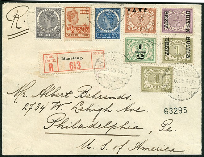 Bont gefr. env. waarop o.a. 'kopstaande' 2c nr. 65f, ½c en 1c nrs. 81f-82f op R-couvert van Magelang 1-6-1925 naar Philadelphia 10-7