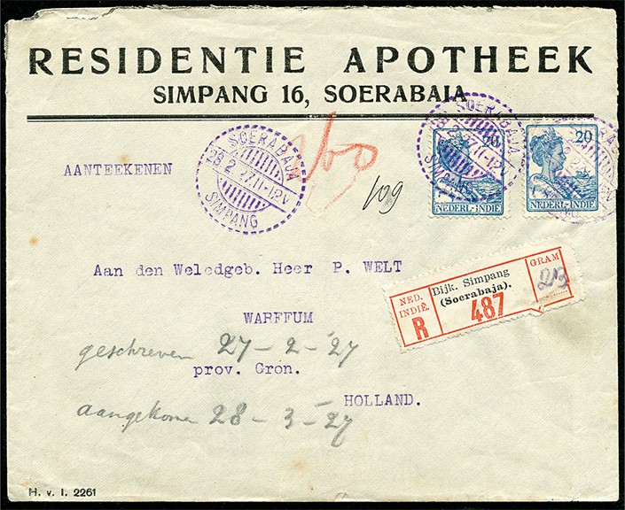 Env. van de Residentie Apotheek gefr. met 2x 20c aangetekend van Soerabaja / Simpang 28-2-1927 naar Warffum. Langebalkstempel bij hoge uitzondering in violet afgestempeld!