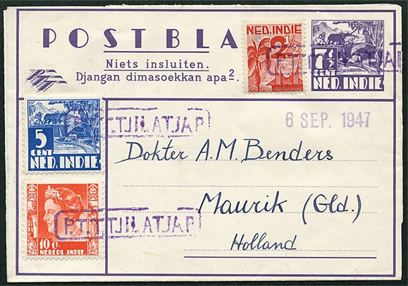 Pb. G5 (helft verwijderd) en bijgefr., 3x keurig afgest. met P.T.T. TJILATJAP met datumstempel 6 SEP. 1947 (Bu.NO3)