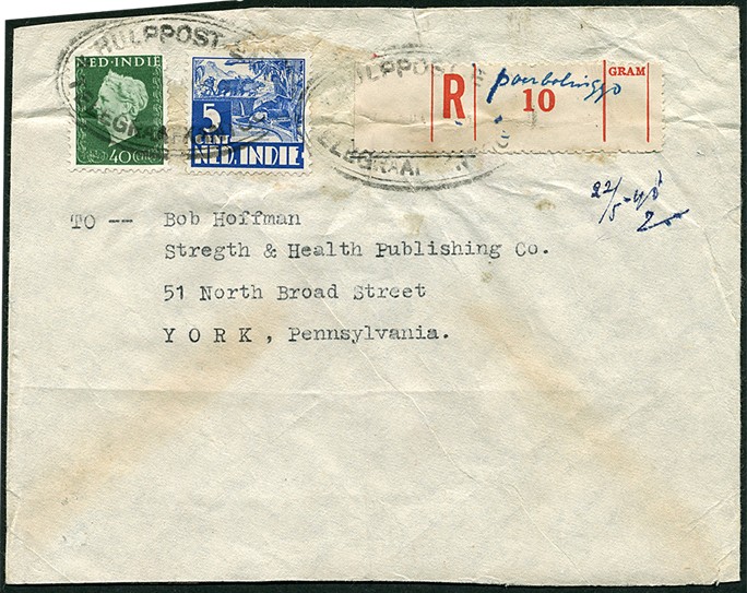 Wat minder fris couvert gefr. met 5c en 40c, afgest. met het ovale noodstempel HULPPOST- EN TELEGRAAFKANTOOR / POERBOLINGGO (Bu.NO31), met op blanco R-strook geschreven kantoornaam waaronder datum 22/5-48