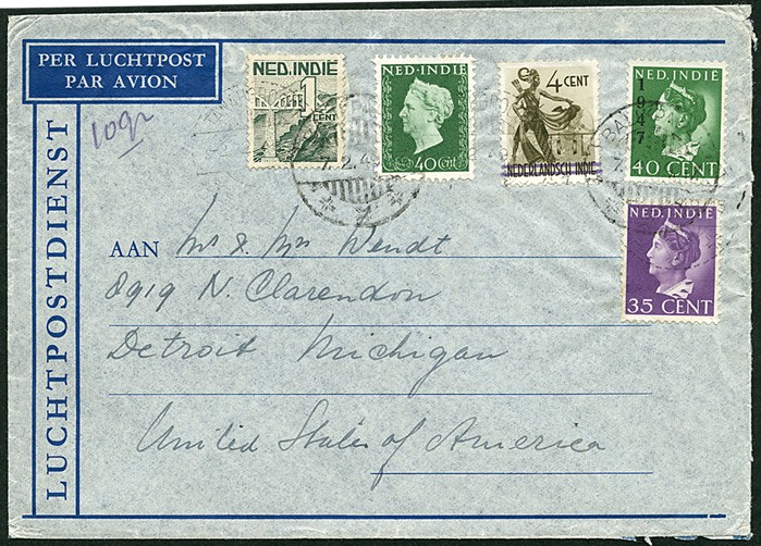 LUCHTPOSTENV. VAN 10 GRAM WAAROP 35 CENT VAN KONIJNENBURG NR. 280 (INGAANDE 1-1-1946 NIET MEER GELDIG, TOCH GEACCEPTEERD, ZEGEL HEEFT HALF TANDJE) EN 4 CENT DANSER NR. 301 MET PENDOORHALING OVER LANDSNAAM (OOK NIET MEER GELDIG, WEL GEACCEPTEERD), ALSMEDE 1 CENT NR. 317, 40 CENT NR. 328 EN 40 CENT NR. 340, VAN TANAHGROGOT 2-2-1949 (ZEER LICHTE AFST.) OVER BALIKPAPAN 7-2 NAAR DE USA. CURIEUZE (OPMAAK)FRANKERING VAN TOTAAL 120 CENT, HOEWEL JUISTE TARIEF 130 CENT BEDROEG (BRIEFPORT 20 CENT + LUCHTRECHT 55 CENT PER 5 GRAM, ZIE SvL, NITAR 485). DOOR ONS NOG GEEN ANDER EX. VAN 35 CENT UIT 1949 BEKEND, NAAR ONZE MENING WEL AUTHENTIEK
