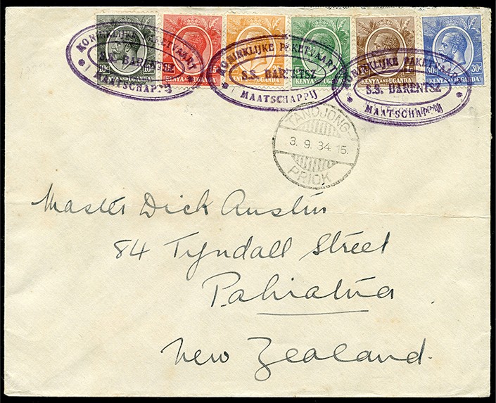 KPM-env. met opwindende 6-kleurenfrankering uit Kenya & Uganda 3x afgest. met KPM-ovaalstempel 'S.S. BARENTSZ', via Tandjongpriok 3-9-1934 naar Nieuw-Zeeland