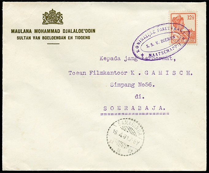 Mooi couvert van de sultan van Boeloengan en Tidoeng (Borneo) gefr. met 12½c afgest. met KPM-ovaalstempel 'S.S. V. DIEMEN' via Samarinda 16-4-1931 naar Soerabaja 20-4