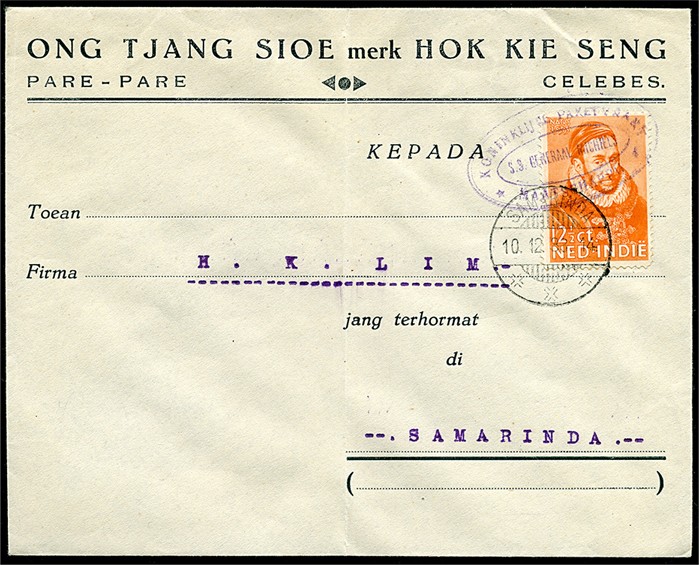Firmacouvert (lichte vert. vouw) uit Pare Pare gefr. met 12½c Prins Willem afgest. met KPM-ovaalstempel 'S.S. GENERAAL MICHIELS' naar Samarinda 10-12-1933