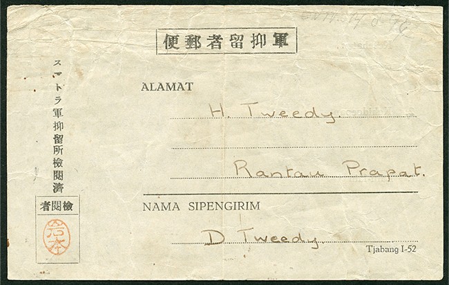 Kamppost. Bu.PW8 van moeder naar vader en Benny te Rantauprapat, ontvangen '14-8-44'. € 300