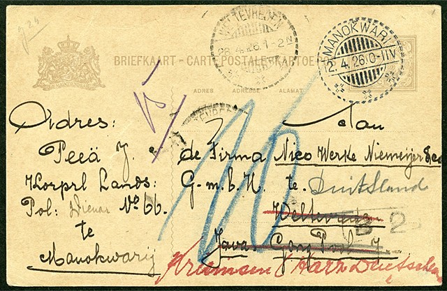 Bk. G35 van Manokwari 12-4-1926 (superbe afst.) naar Weltevreden en daar op 28-4 doorgez. naar Duitsland