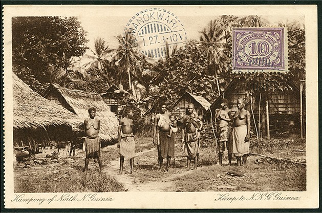 Prentbk. van kampong met dorpelingen in Noord Nieuw-Guinea, op beeldzijde beplakt met zegel van 10c, afgest. Manokwari 26-1-1927. Ex Jennings