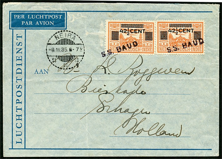 Luchtpostenv. (niet storend gevouwen) met afz. 'C. Roggeveen, p/a Luchtkarteeringsexpeditie, Babo, Nieuw-Guineé', gefr. met 2x 42½c beide afgest. met KPM-naamstempel 'S.S. BAUD' via Neira 9-11-1935 naar Nederland