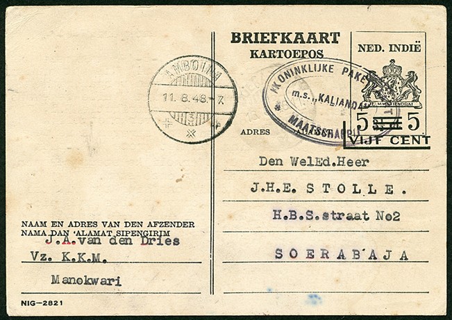Bk. G76b (iets smoezelig) geschreven te Manokwari 7-8-1948 afgest. met KPM-ovaalstempel 'm.s. "KALIANDA"', via Amboina 11-8 naar Soerabaja
