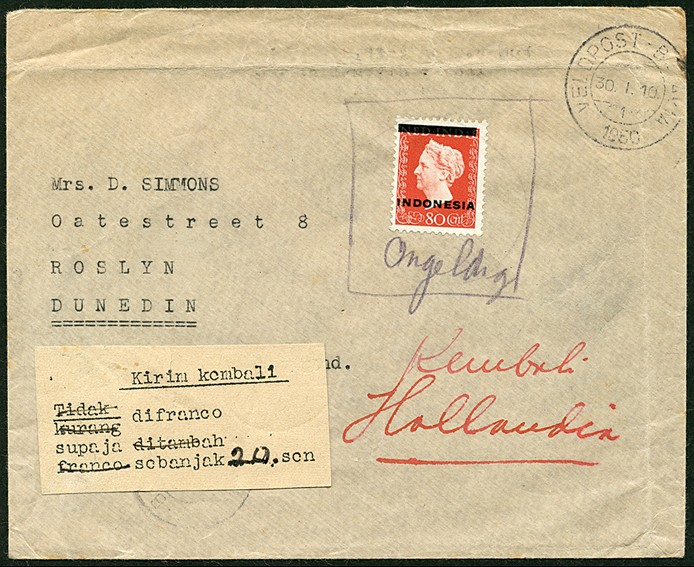 Env. (geadresseerde uit Ifar, 7th Fleet, Hollandia) gefr. met 80c met bestemming Nieuw Zeeland, zegel ongeldig en via Veldpost-Batavia 30-1-1950 terug naar Hollandia ('Kembali Hollandia'). Op vz. label geplakt met Indonesische tekst retour afz. 20 sen te betalen