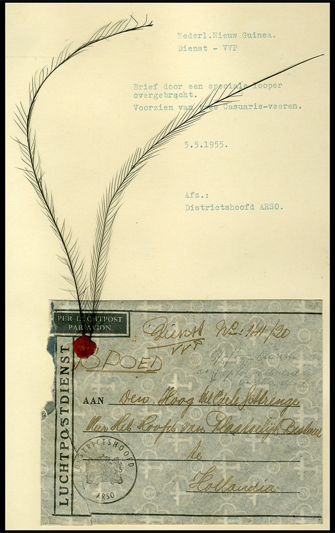 VERENBRIEF OFTEWEL 'POS TERBANG'. LUCHTPOSTENVELOPPE GEBRUIKT ALS DIENSTBRIEF No. 141/20 (VVP = VRIJ VAN PORT) DOOR HET DISTRICTSHOOFD VAN ARSO (CA. 30 KM TEN ZUIDEN VAN HOLLANDIA), DIE LINKSBOVEN TWEE CASUARISVEREN MET LAK HEEFT BEVESTIGD, DOOR EEN DAARTOE AANGEWEZEN LOPER GEBRACHT NAAR HET HOOFD VAN HET PLAATSELIJK BESTUUR TE HOLLANDIA. OP DE VOORZIJDE IS MET POTLOOD GESCHREVEN '5/5/'55 - 6 u nm aan [met pijltje wijzend in de richting van de geadresseerde] op het voetbalveld overhandigd', KORTOM, OP 5 MEI 1955 OM 6 UUR IN DE NAMIDDAG HEEFT DE BRIEF DE GEADRESSEERDE OP HET VOETBALVELD BEREIKT, DIE DE BRIEF VERVOLGENS LINKS WAT RUW HEEFT GEOPEND. WAARSCHIJNLIJK STOND HIJ NAAR EEN VOETBALWEDSTRIJD TE KIJKEN, PRECIES 10 JAAR NA DE BEVRIJDING VAN NEDERLAND! OP DE ACHTERZIJDE VAN DE ENVELOPPE STAAN GEEN STEMPELS OF GESCHREVEN MEDEDELINGEN. HOOGST WAARSCHIJNLIJK DE ENIG BEKENDE VERENBRIEF UIT (NEDERLANDS) NIEUW-GUINEA, BOVENDIEN NIET VOORZIEN VAN HANENVEREN MAAR VEREN VAN DE CASUARIS, EEN GROTE LOOPVOGEL DIE SOLITAIR IN HET OERWOUD VAN NIEUW-GUINEA LEEFT. KEURIG INGELIJST, SPECTACULAIR POSTSTUK DAT HET ABSOLUTE PRONKSTUK IS VAN BIJV. EEN BELANGRIJKE TENTOONSTELLINGSCOLLECTIE NIEUW-GUINEA. EX BUNGE EN BENDER. De brief wordt tijdens de kijkdagen NIET uit de lijst gehaald