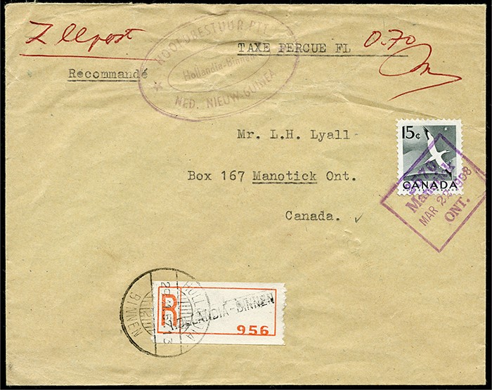 Couvert van het Hoofdbestuur PTT te Hollandia-Binnen aangetekend op 29-11-1957 per zeepost naar Canada, port 70c in baar geld voldaan, via Sorong 21-12, Singapore 7-2-1958 en Toronto 21-3 naar bestemming Manotick 22-3, waar een frankeerzegel van 15c als portzegel werd gebruikt. Kopie artikel bijgesloten