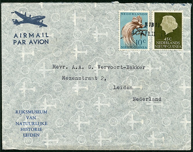 Luchtpostenv. gefr. met 10c en 45c, afgest. met naamstempel SIBIL / 21 APRIL 1959 (afz. W. Vervoort, Ok Sibil, via Tanah Merah) naar Leiden