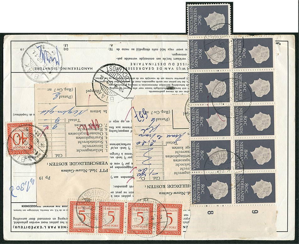 Twee adreskaarten van 1962 uit Nederland met op de az. beplakt met etiketten Pp19, frankeer- en portzegels van Ned. Nieuw-Guinea. Zeer interessant, bovendien zijn echt gebruikte portzegels (dus geen maakwerk) van NNG op poststuk flink schaars