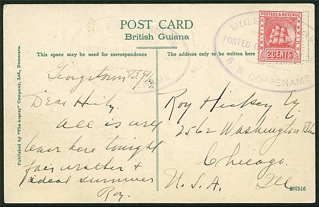 Prentbk. uit Brits-Guiana 2x afgest. in violet met ovaal Engelstalig KWIM-stempel 'POSTED ON THE HIGH SEAS' van het 'S.S. COPPENAME'. Zeldzaam!