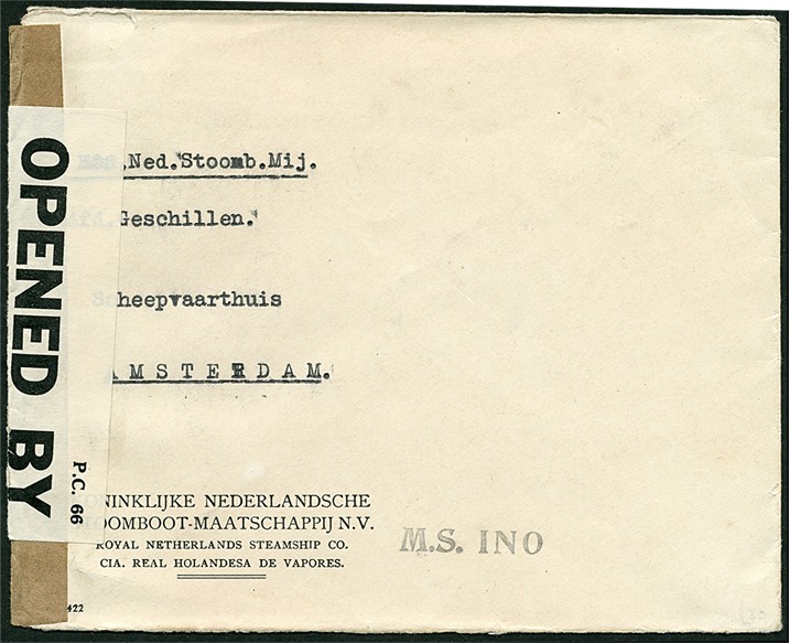 KNSM-couvert (2 zijden geopend) afgest. met naamstempel 'M.S. INO' ca. 1939 verz. naar Amsterdam. Het M.S. INO was een kustvaartuig van de KNSM (1936), voor de kustvaart in West-Indië. Stempels op poststuk zijn een rariteit!