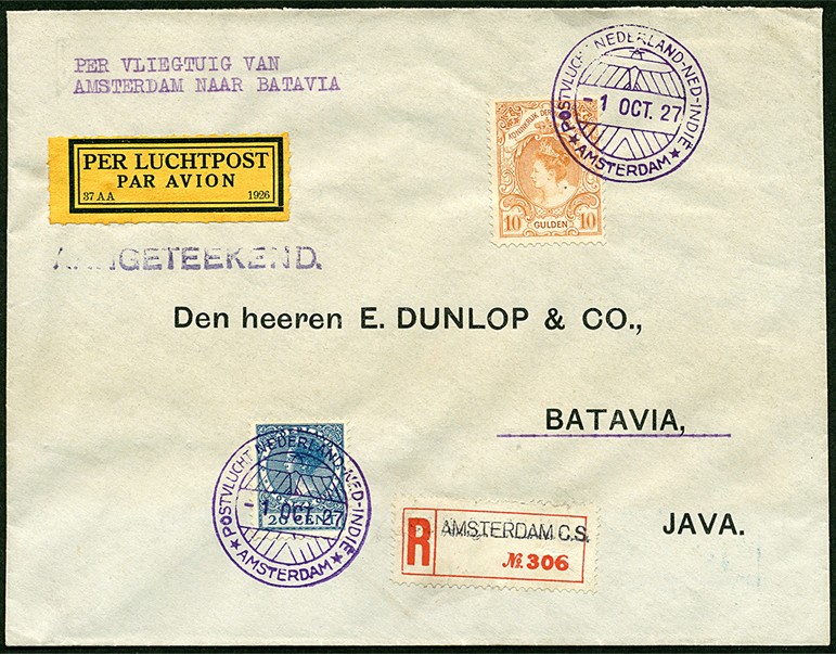KOPPENVLUCHT. 10 Gulden Bontkraag en 20c Veth met speciale afst. op R-couvert via Weltevreden 10-10-1927 naar Batavia 11-10. VH.B.14d