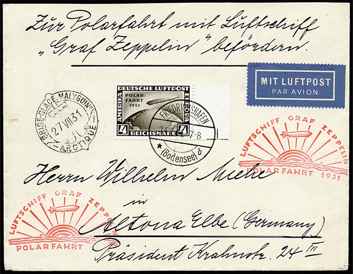 Zeppelinpost. Germany. Polar Flight 24-31 July 1931. Very fine cover bearing 4RM as a single franking from Friedrichshafen to the Malyguin. S.119C. € 1100