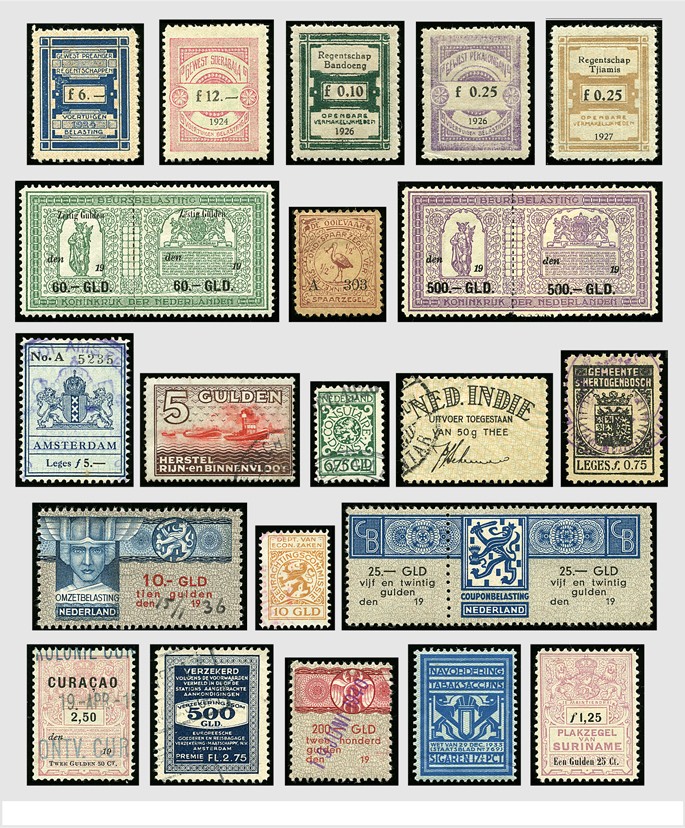 POSTHISTORIE, Nederland en Overzeese Gebiedsdelen Belasting- en Legeszegels en Lokale Belastingzegels 1637-1949. Enorm uitgebreide verz. wb. Beurs-, Omzet-en Couponbelasting, Tabaksbanderollen, Handelszegels, etc. Veel van het materiaal door ons niet eerder gezien ! Prachtkoop op grote blanco bladen met waarschijnlijk een zeer hoge waarde !