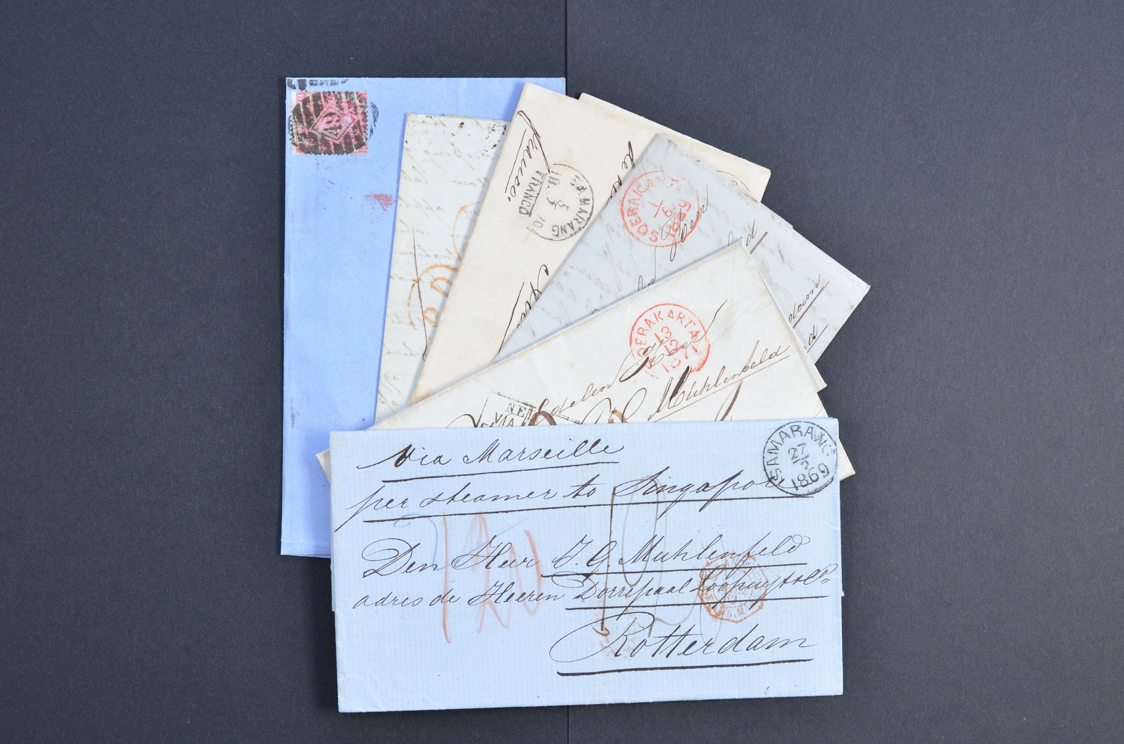 NED.- INDIË POSTHISTORIE. 4 Vouwbrieven 1869-71 (1 ex. zegels verwijderd), alsmede 2 uit Engeland (1845, 1867)