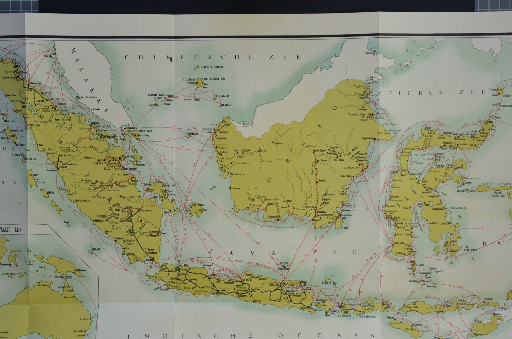 NED.- INDIË. Mooie uitvouwbare Kaart der Stoomvaartlijnen van de KPM (1928) en kleurijke folder van div. scheepvaartmaatsch. 'The Netherlands Indies Welcome You'