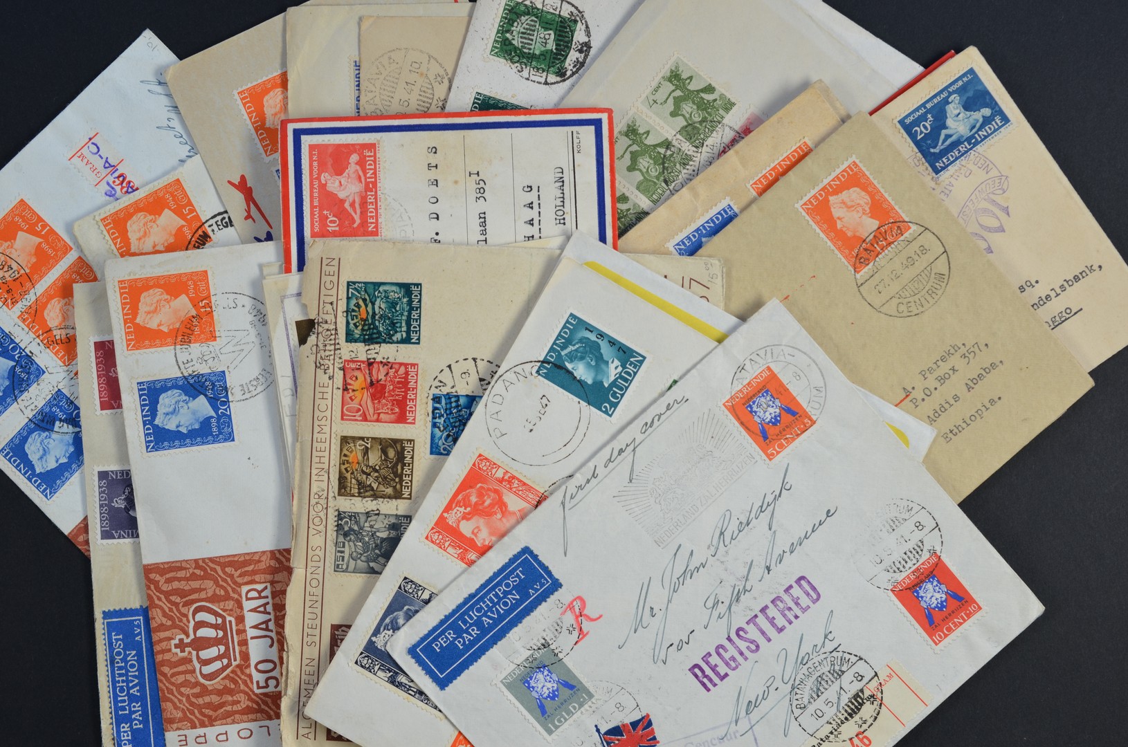 NED.- INDIË. 28 Poststukken 1937-49 met eerste dag-afstempelingen voor de zegels (w.o. doubletten)