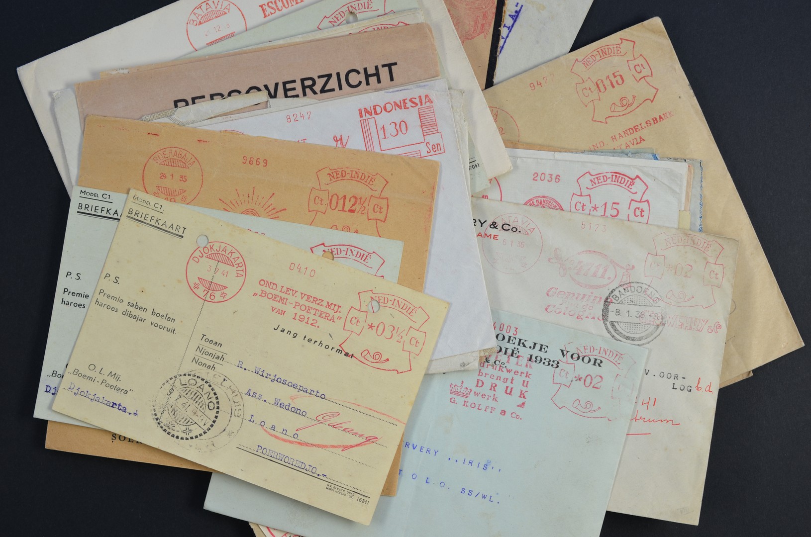 NED.- INDIË POSTHISTORIE. Roodfrankeringen. Partijtje poststukken (enkele met perforatiegaten), aangetekend (w.o. env. naar Zanzibar!), gecensureerd en wat knipsels