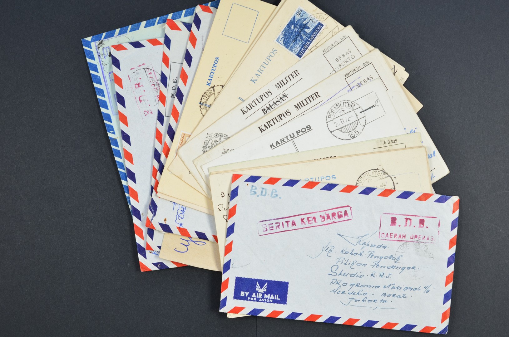 INDONESIË POSTHISTORIE. 22 Veldpoststukken van diverse militaire operaties 1969-74 in o.a. Irian en Kalimantan, waarop Pos Militer, B.D.B. / Daerah Operasi (Bea Di Bajar, port betaald), Berita Keluarga (soort censuurstempel: inhoud betreft familieberichten). Interessant